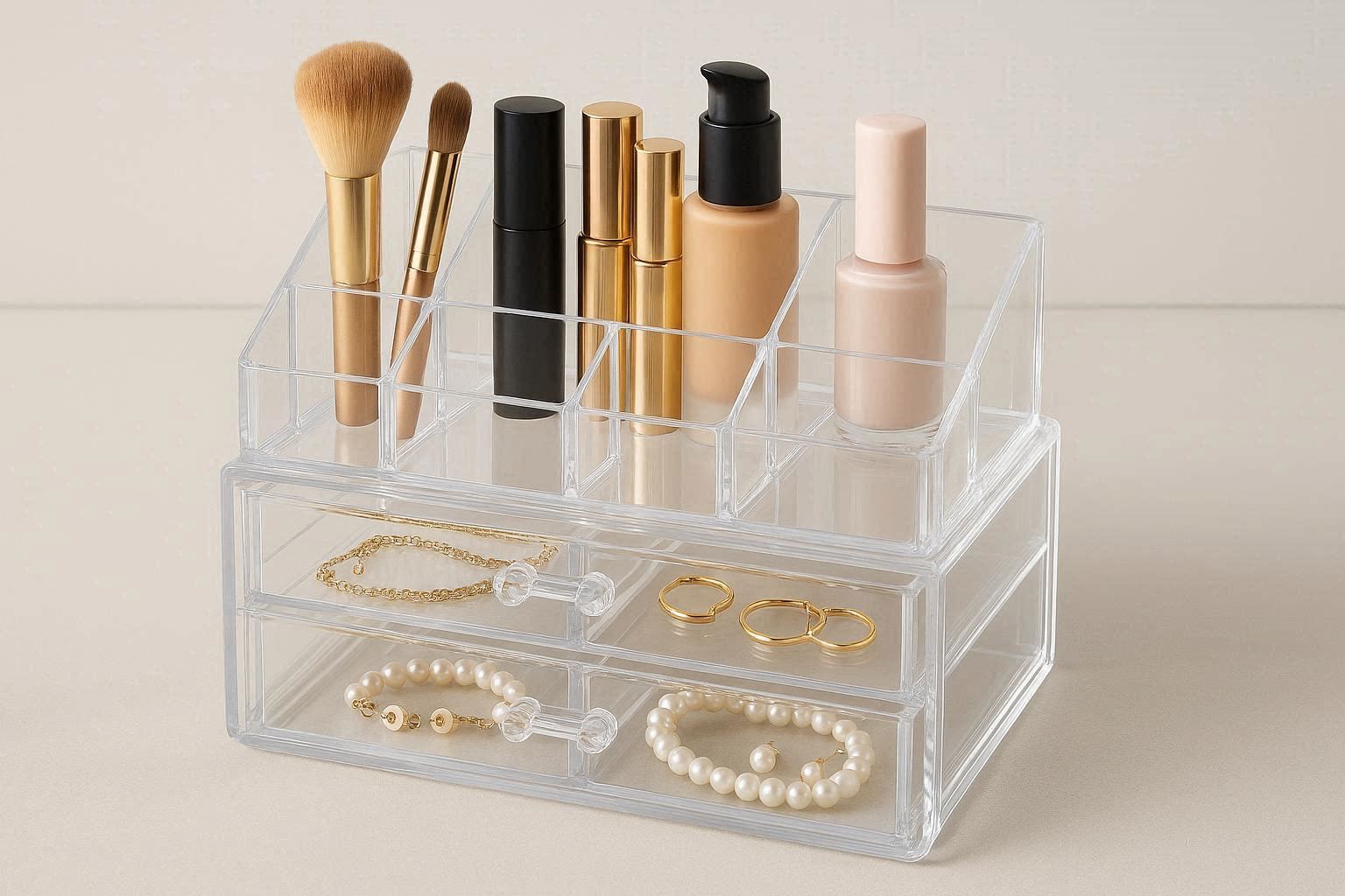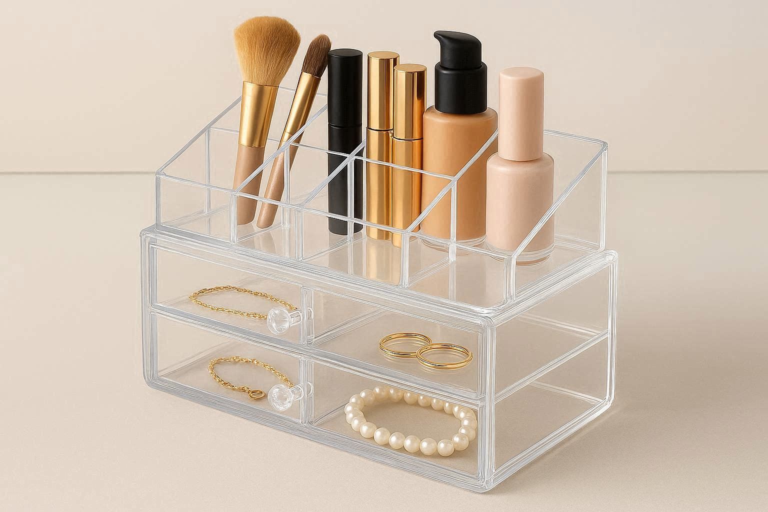 Acrylic Desktop Organizer with Clear Compartments for Cosmetics and Jewelry