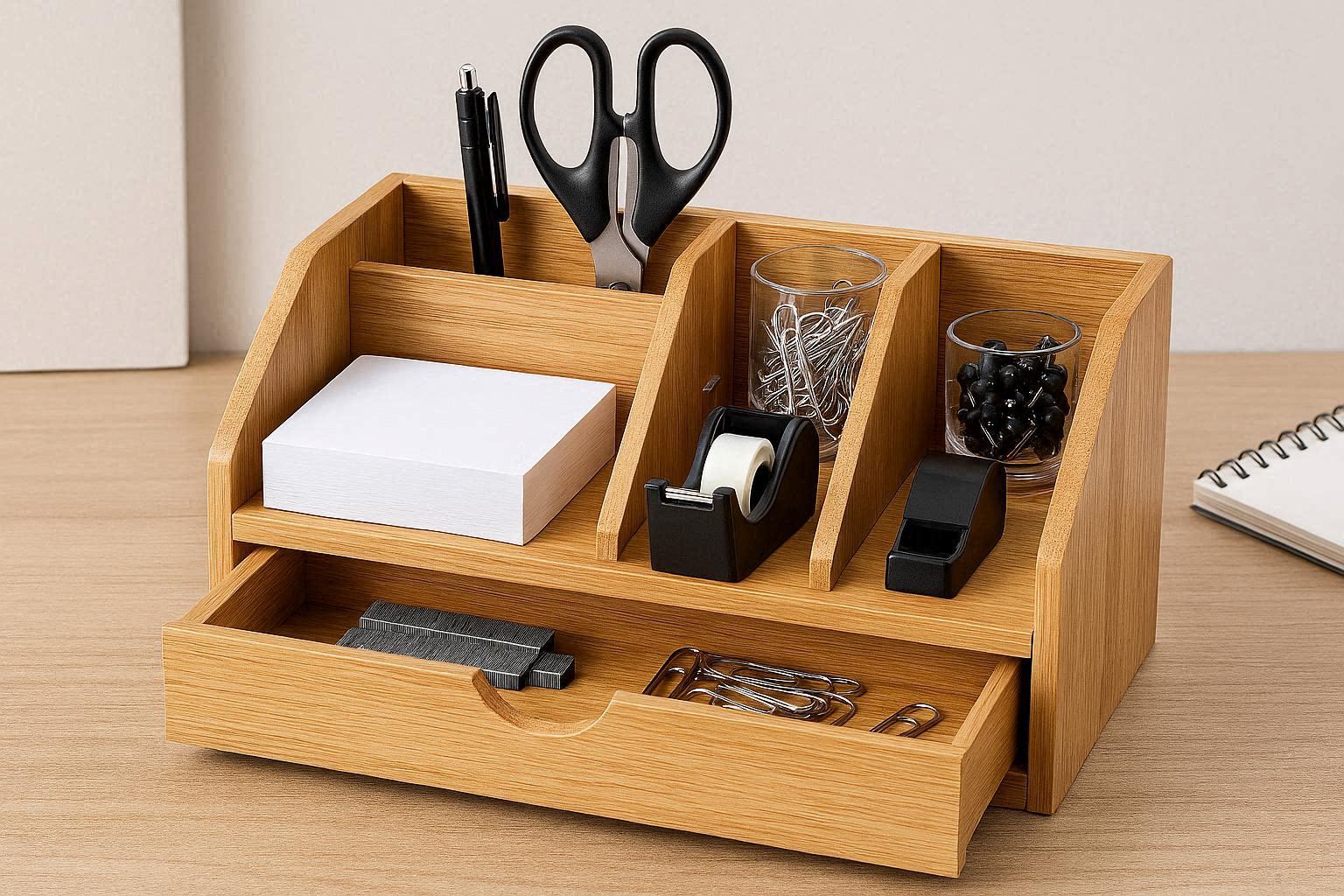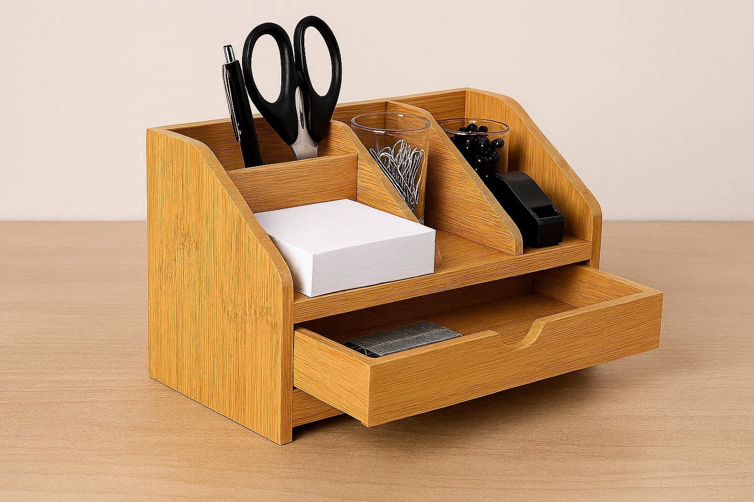 The organizer??s compact design fits seamlessly on most desks without taking up excessive space, while its natural wood grain adds a warm, minimalist touch to any workspace. It??s assembled with reinforced joints for long-lasting durability, and the drawer slides smoothly on built-in wooden tracks. Ideal for home offices, student desks, or professional workspaces, it helps reduce clutter and keep essentials within reach.
