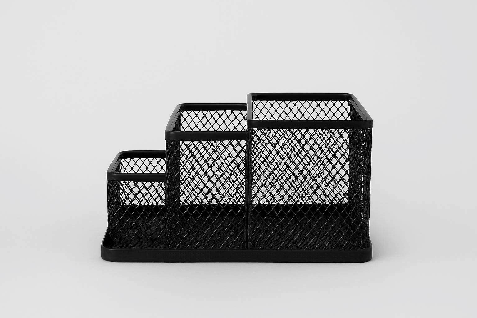Made from durable, rust-resistant steel mesh, this desktop storage box measures 10 x 6 x 4 inches, providing a sleek and functional way to organize stationery. It features 5 separate compartments, including 3 small slots for pens and pencils, 1 medium slot for rulers and erasers, and 1 large slot for notebooks or tablets up to 10 inches. The mesh design allows for breathability and easy visibility of contents.