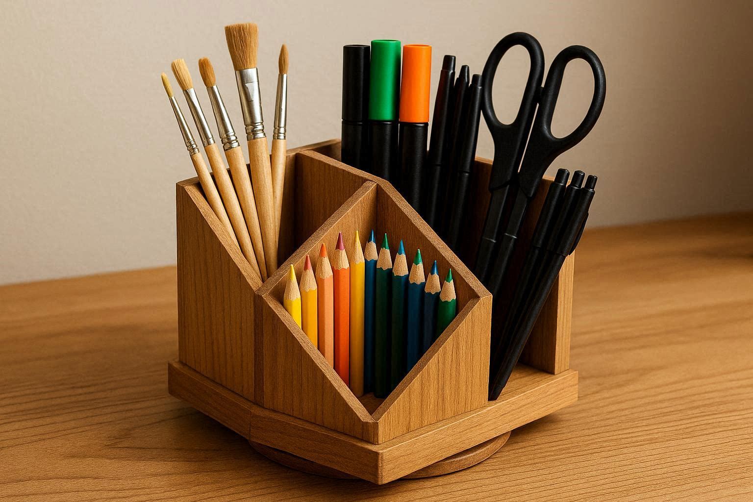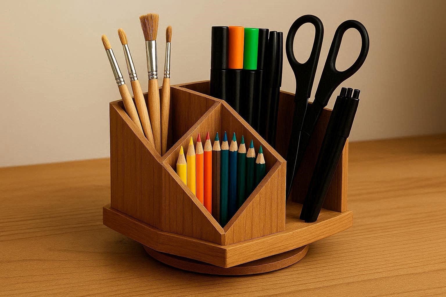 Wooden Desktop Caddy with Rotating Compartments for Art Supplies
